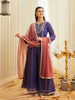 Violet silk embroidered top sharara set with dupatta. Crafted from luxurious silk fabric, the kurta features delicate embroidery that adds a refined ethnic touch. Paired with a flowy sharara and a contrast dupatta, this set is perfect for festive occasions, weddings, and celebrations where effortless elegance matters.