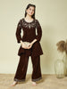 This embroidered velvet co-ord set for girls with gold or pearl studs, ethnic sandals or block heels, and an embellished clutch for a festive look. Soft waves or a half-tied hairstyle with warm-toned makeup perfectly complement this party wear velvet co-ord set, offering comfort and elegance