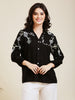 This Black Embroidered Crepe Shirt features elegant threadwork on the shoulders and sleeves, full sleeves with gathered cuffs, and a smart button-down design for a chic, contemporary look.