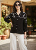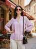 This Lavender Embroidered Crepe Shirt features elegant threadwork on the shoulders and sleeves, full sleeves with gathered cuffs, and a smart button-down design for a chic, contemporary look.