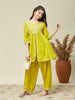 The Girl's Teal Blue Chinon Embroidered Kurta Palazzo Set is a vibrant and stylish outfit made from lightweight Chinon fabric. Featuring delicate embroidery and a flared palazzo, it offers a fun yet elegant look—perfect for festive occasions, parties, and family functions
