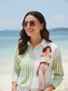 Green and white cotton shirt combines bold vertical stripes with a chic illustrated graphic print for a trendy, statement-making look. Designed with a collared neckline, button-down front, and 3/4 sleeves, it offers both comfort and style for casual outings. The relaxed fit and breathable fabric make it a versatile pick for your everyday wardrobe.