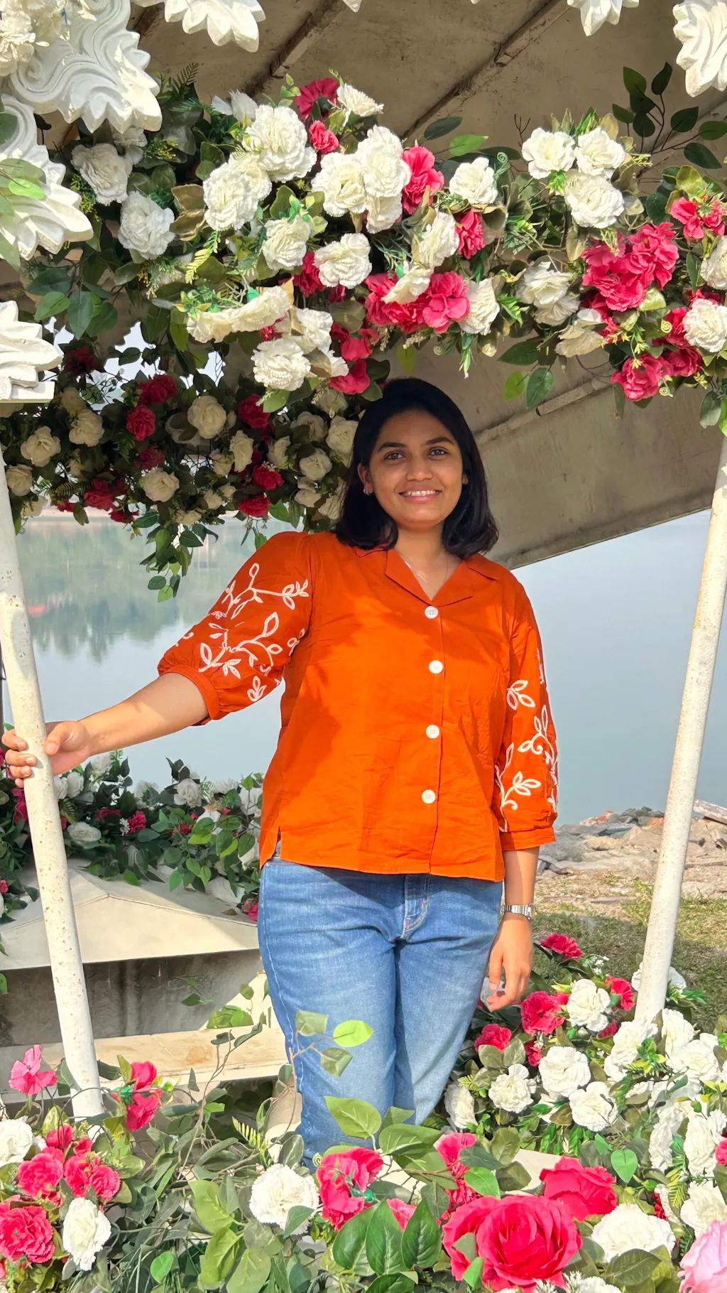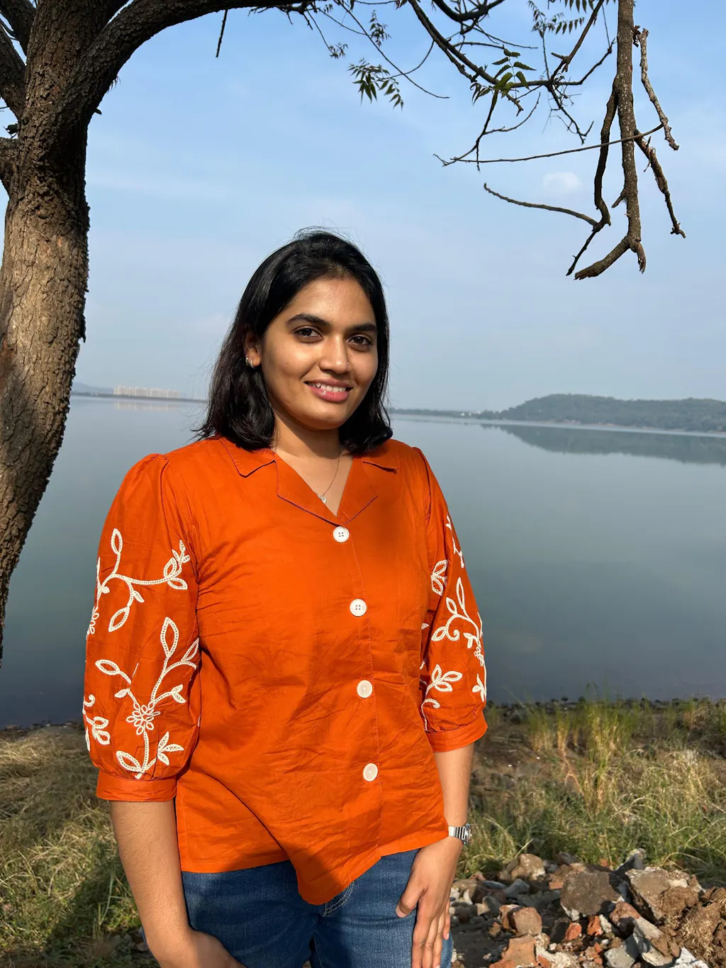 Orange Cotton Embroidered Shirt for Women