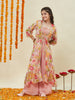 Pink Embroidered Georgette Top, Plazoo Shurg Set for girls this delightful pink georgette set. The outfit features a beautifully embroidered tube top paired with flowy palazzo pants for comfort and grace. The floral printed shrug with ruffle hem and waist tie-up detail adds a playful yet elegant touch. Crafted from lightweight georgette, this ensemble is perfect for festive occasions, family functions, or special celebrations.