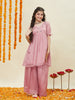 Rani kurti and sharara set, perfect for festive occasions. Featuring delicate floral embroidery, subtle sequin work, and puff sleeves with tie-up details, it blends elegance with playful charm. The flowy sharara adds grace, making it ideal for weddings or celebrations. Pair with juttis, a floral hairband, and a potli bag for a complete traditional look.